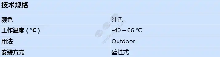 插入式设计,具有防篡改、防雨 (NEMA 3R) 结构 15 cd、15/75 cd、30 cd、75 cd、95 cd、110 cd和115 cd的现场可选设置 安装前短接安装板上的弹簧以进行导通检查 室外壁挂式安装 颜色 红色 安装方式 壁挂式 工作温度(°C) -40 – 66 °C 用法 Outdoor