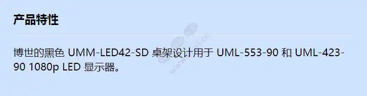 博世的黑色 UMM-LED42-SD 桌架设计用于 UML-553-90 和 UML-423-90 1080p LED 显示器。 安装类型 Desk/Table 颜色 黑色的 容量 70 至 109 磅 风格 固定的 孔型 风俗 显示类型 平板 家庭控制 Wi-Fi 方向 景观 报警输入输出 2/2 最大显示尺寸 55 至 64 英寸