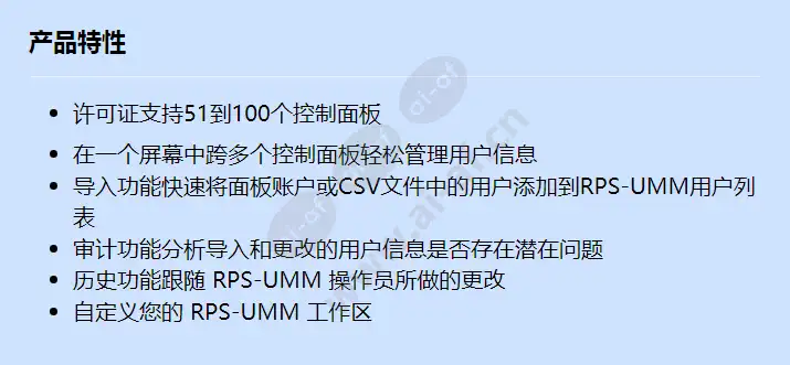 许可证支持51到100个控制面板 在一个屏幕中跨多个控制面板轻松管理用户信息 导入功能快速将面板账户或CSV文件中的用户添加到RPS-UMM用户列表 审计功能分析导入和更改的用户信息是否存在潜在问题 历史功能跟随 RPS-UMM 操作员所做的更改 自定义您的 RPS-UMM 工作区 操作系统 Windows 7、Windows 8、Windows 8.1、Windows 10、Windows Server 2008、Windows Server 2012 R2 SQL Express 2012 SP2 处理器类型 x64 处理器:AMD Opteron、AMD Athlon 64、支持 Intel EM64T 的 Intel Xeon、支持 EM64T 的 Intel Pentium IV x86 处理器:Pentium III 兼容处理器或更快 处理器速度 最低:x86 处理器:1.0 GHzx64 处理器:1.4 GHz 推荐:2.0 GHz 或更快 内存 最低:4 GB 推荐:8 GB(随着数据库大小的增加而增加以获得很好性能) 硬盘 可用空间:x86 处理器:16 GBx64 处理器:20 GB 监视器 最低分辨率:1024 x 728