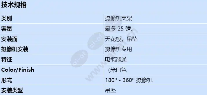 博世的 VDA-70112-PMT 是用于 FLEXIDOME IP 全景 7000 系列摄像机的吊装支架。 类别 摄像机支架 容量 最多 25 磅。 安装面 天花板,吊坠 摄像机安装 摄像机专用 Color/Finish (米白色 特征 电缆馈通 形式 180º - 360º 摄像机 安装类型 吊坠