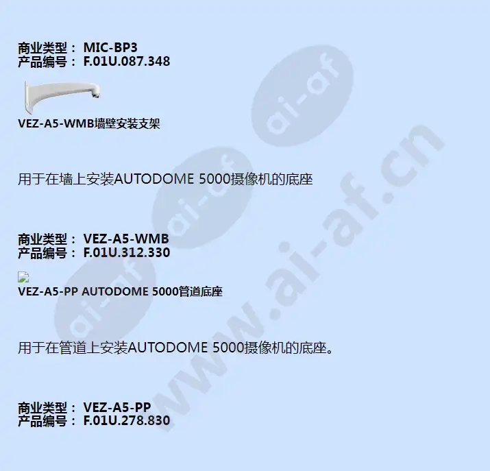博世BOSCH VEZ-523-EWTR AUTODOME 5000、960H、36 倍 PTZ 摄像机 NTSC、室外、有色球型罩 具有高强度有色球型罩的室外 NTSC PTZ 摄像机 商业类型: VEZ-523-EWTR 产品编号: F.01U.288.453 提供 432 倍变焦(36 倍扩展变焦,12 倍数字变焦)的真正的日/夜两用 PTZ 球型摄像机 高达 720 电视线的超高清晰度(在具有宽动态范围的情况下为 960H) 防暴外壳 隐私遮挡、图像增强、移动侦测和宽动态范围 包括室内和室外型号,适用于大量应用场合 详细信息 系统 PAL 或 NTSC 图像感应器 960H,1/4 英寸 双扫描 CCD,720 电视线感应器清晰度 有效像素(水平x垂直) 大约 570,000;976 x 582 (PAL) 大约 480,000;976 x 494 (NTSC) 水平分辨率 720 电视线(960H,具有宽动态功能) 镜头 3.43毫米 – 120毫米 对焦 恒定、手动、聚光 光圈 自动、手动 光学变焦视场 (DxHxV) 广角:72.3° x 57.8° x 43.4°长焦:2.13° x 1.70° x 1.28° 增益控制 自动、手动 数字变焦 12 倍 灵敏度(典型) 30 IRE 白昼模式 0.1 Lux 夜晚模式(黑白) 0.01 Lux 电子快门速度 PAL 1/50 至 1/10000 秒 NTSC 1/60 至 1/10000 秒 宽动态范围 (WDR) On(开)、Off(关) 信噪比 >50dB(在关闭自动增益控制的情况下) 白平衡 自动、手动、室内、室外、自动跟随白平衡 视频输出 1.0Vp-p/75Ω,BNC 遥摄范围 连续 360° 俯仰范围 0° 至 180° 手动速度 每秒 0.5° 至 90° 预置位速度 每秒 5° 至 360°