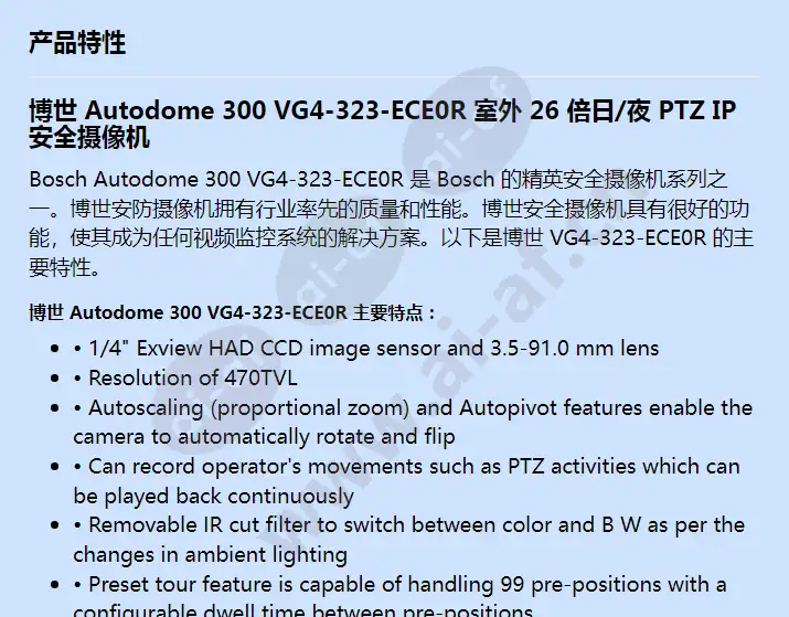 博世 Autodome 300 VG4-323-ECE0R 室外 26 倍日/夜 PTZ IP 安全摄像机 Bosch Autodome 300 VG4-323-ECE0R 是 Bosch 的精英安全摄像机系列之一。博世安防摄像机拥有行业率先的质量和性能。博世安全摄像机具有很好的功能,使其成为任何视频监控系统的解决方案。以下是博世 VG4-323-ECE0R 的主要特性。 博世 Autodome 300 VG4-323-ECE0R 主要特点: • 1/4" Exview HAD CCD image sensor and 3.5-91.0 mm lens • Resolution of 470TVL • Autoscaling (proportional zoom) and Autopivot features enable the camera to automatically rotate and flip • Can record operator's movements such as PTZ activities which can be played back continuously • Removable IR cut filter to switch between color and B W as per the changes in ambient lighting • Preset tour feature is capable of handling 99 pre-positions with a configurable dwell time between pre-positions • Customize the order and frequency of each preset • Supports 2 recording tours