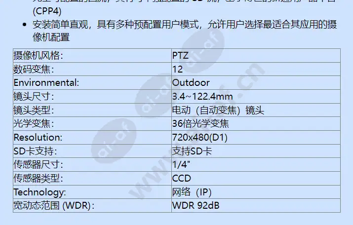 博世 VG5-7036-E2PC4 室外吊装 IP 安防摄像机 AUTODOME 7000 IP 是一款易于安装的高速 PTZ 半球摄像机,采用经过现场验证的外壳,适合室内或室外安装,可全天候提供很好的图像质量和网络性能。该摄像机提供对所有球机功能的完整网络控制,包括平移/倾斜/变焦操作、预设、巡视和警报以及所有球机设置的基于网络的配置。它还使用 H.264 压缩/带宽限制提供直接网络视频流,以有效管理带宽和存储要求,同时提供出色的图像质量。 主要特征: 日/夜网络摄像机,具有 28 倍或 36 倍光学变焦(12 倍数码变焦)、宽动态范围 (WDR) 和钠蒸气白平衡模式,可将物体恢复到原始颜色 带有板载智能视频分析 (IVA) 的新型智能跟随和警报规则引擎 通过双记录选项(iSCSI、SD 卡)增强系统灵活性 完全可配置的四流,具有可单独配置的 SD 流,基于博世的新通用产品平台 (CPP4) 安装简单直观,具有多种预配置用户模式,允许用户选择最适合其应用的摄像机配置 摄像机风格: PTZ 数码变焦: 12 Environmental: Outdoor 镜头尺寸: 3.4~122.4mm 镜头类型: 电动(自动变焦)镜头 光学变焦: 36倍光学变焦 Resolution: 720x480(D1) SD卡支持: 支持SD卡 传感器尺寸: 1/4" 传感器类型: CCD Technology: 网络(IP) 宽动态范围 (WDR): WDR 92dB