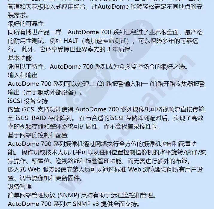博世 BOSCH VG5-714-ECE2 AutoDome 700 系列 36x PAL IP 吊装摄像机 商业类型:VG5-714-ECE2 产品编号:F.01U.217.833 VG5-714-ECE2 F.01U.217.833 有 36x 或 28x 日/夜两用型摄像机可供选择,都具有 12x数字变焦和宽动态范围 逐行扫描能够在观看移动画面的细节时提供流畅和清晰的图像 钠汽灯白平衡模式能够将对象还原至其原有色彩 同步生成四个视频流 H.264 和 M-JPEG 视频流 符合 ONVIF 标准;与其它符合该标准的系统具有互操作性 AutoDome 700 系列是一款室内/室外 IP PTZ 摄像机,易于安装,具备很好的视频质量。 这款精巧细致的高速球型摄像机可在低光照条件下拍摄优质的图像。 AutoDome 700 系列提供直接网络接口,并且采用 H.264 和 M-JPEG 压缩以及带宽限制技术,不但能高效地管理带宽和存储要求,同时还能提供出色的图像品质。 AutoDome 700 系列使您可以通过网络完全控制球型摄像机的所有功能,包括水平旋转/俯仰/变焦操作、预置位、巡视路线和报警,并可通过 Web 配置球型摄像机的所有设置。 AutoDome 700 系列符合 ONVIF(开放式网络视频接口论坛)和 NTCIP 标准。 符合 ONVIF 可保证不管是哪个生产商制造的网络视频产品,AutoDome 都能与之相互操作。 符合 NTCIP 可保证 AutoDome 能够集成至传输管理设备。 AutoDome 700 系列亮点AutoDome 700 系列具有很先进的技术和功能,远远超过其他 PTZ 摄像机。 摄像机拥有 550 电视线的高水平清晰度,可重现清晰和细致的图像。 摄像机采用逐行扫描技术、宽动态范围和钠汽灯白平衡,即使在极端的光照环境下也能够确保图像细节清