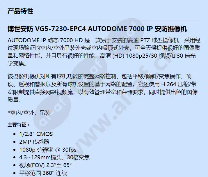 博世安防 VG5-7230-EPC4 AUTODOME 7000 IP 安防摄像机 AUTODOME IP 动态 7000 HD 是一款易于安装的高速 PTZ 球型摄像机,采用经过现场验证的室内/室外吊装外壳或室内吸顶式外壳,可全天候提供很好的图像质量和网络性能,并且具有很好的性能。高清 (HD) 1080p25/30 视频和 30 倍光学变焦。 该摄像机提供对所有球机功能的完整网络控制,包括平移/倾斜/变焦操作、预设、巡视和警报以及所有球机设置的基于网络的配置。它还使用 H.264 压缩/带宽限制提供直接网络视频流,以有效管理带宽和存储要求,同时提供出色的图像质量。 *室内/室外,吊装 主要特征: 1/2.8" CMOS 2MP 传感器 1080p 分辨率 @ 30fps 4.3~129mm镜头,30倍变焦 视场(FOV) 2.3°至 65° 平移范围 360° 连续 倾斜角度高于地平线 1° 日/夜功能、红外滤光片 低照度技术 宽动态范围 降噪 智能视频分析 SD卡插槽 Vandalproof Weatherproof 摄像机风格: 半球 PTZ Durability: 防暴 防风雨 Environmental: Outdoor 镜头尺寸: 4.3~129mm 镜头类型: 电动(自动变焦)镜头 光学变焦: 30倍光学变焦 产品系列: 博世Autodome系列 Resolution: 2MP SD卡支持: 支持SD卡 传感器尺寸: 1/2.8" 传感器类型: CMOS Technology: 网络(IP) Warranty: 3 年制造商保修