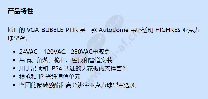 博世的 VGA-BUBBLE-PTIR 是一款 Autodome 吊坠透明 HIGHRES 亚克力球型罩。 24VAC、120VAC、230VAC电源盒 吊墙、角落、桅杆、屋顶和管道安装 用于吊顶和 IP54 认证的天花板内支撑套件 模拟和 IP 光纤通信单元 坚固的聚碳酸酯和高分辨率亚克力球型罩选项 物品种类 半球罩 球型罩直径 6 英寸 球型罩饰面 Smoked/Tinted 家庭控制 Wi-Fi 报警输入输出 2/2 摄像机家族 AutoDome 外壳兼容性 半球型摄像机、悬垂式云台 球型罩应用 防破坏 (IK10+) 安装选项 吊坠 修剪选项 无装饰环