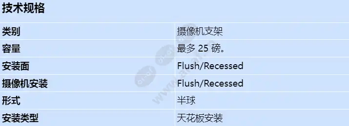 博世 VJR-A3-IC 是一款嵌入式安装座,适用于不需要 IP54 或阻燃等级的室内摄像机应用。 负载能力高达 25 磅(11.33 千克) 兼容 AutoDome Junior 摄像机 类别 摄像机支架 容量 最多 25 磅。 安装面 Flush/Recessed 摄像机安装 Flush/Recessed 形式 半球 安装类型 天花板安装