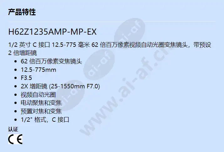 H62Z1235AMP-MP-EX 1/2 英寸 C 接口 12.5-775 毫米 62 倍百万像素视频自动光圈变焦镜头,带预设 2 倍增距镜 62 倍百万像素变焦镜头 12.5-775mm F3.5 2X 增距镜 (25-1550mm F7.0) 视频自动光圈 电动聚焦和变焦 预置对焦和变焦 1/2" 格式,C 接口 认证