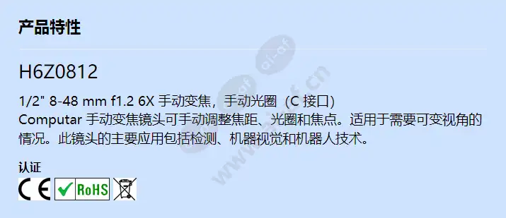 H6Z0812 1/2" 8-48 mm f1.2 6X 手动变焦,手动光圈(C 接口) Computar 手动变焦镜头可手动调整焦距、光圈和焦点。适用于需要可变视角的情况。此镜头的主要应用包括检测、机器视觉和机器人技术。 认证