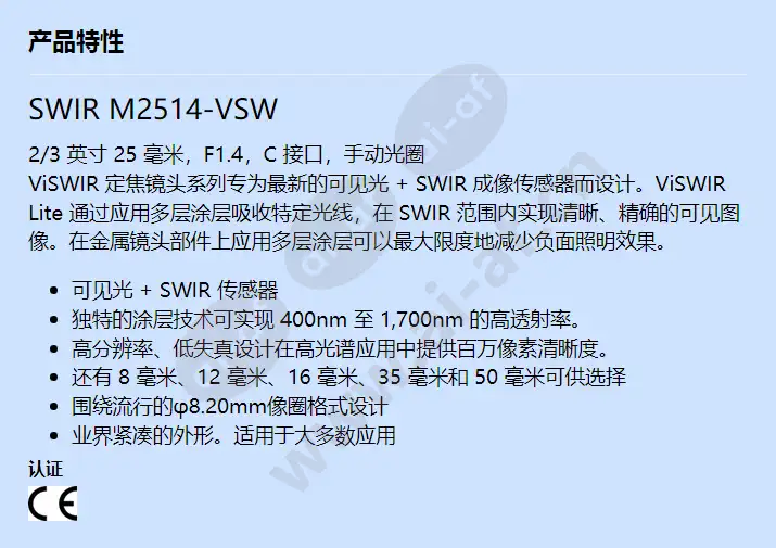 SWIR M2514-VSW 2/3 英寸 25 毫米,F1.4,C 接口,手动光圈 ViSWIR 定焦镜头系列专为最新的可见光 + SWIR 成像传感器而设计。ViSWIR Lite 通过应用多层涂层吸收特定光线,在 SWIR 范围内实现清晰、精确的可见图像。在金属镜头部件上应用多层涂层可以最大限度地减少负面照明效果。 可见光 + SWIR 传感器 独特的涂层技术可实现 400nm 至 1,700nm 的高透射率。 高分辨率、低失真设计在高光谱应用中提供百万像素清晰度。 还有 8 毫米、12 毫米、16 毫米、35 毫米和 50 毫米可供选择 围绕流行的φ8.20mm像圈格式设计 业界紧凑的外形。适用于大多数应用 认证