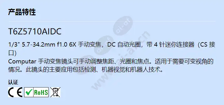 T6Z5710AIDC 1/3" 5.7-34.2mm f1.0 6X 手动变焦,DC 自动光圈,带 4 针迷你连接器(CS 接口) Computar 手动变焦镜头可手动调整焦距、光圈和焦点。适用于需要可变视角的情况。此镜头的主要应用包括检测、机器视觉和机器人技术。 认证