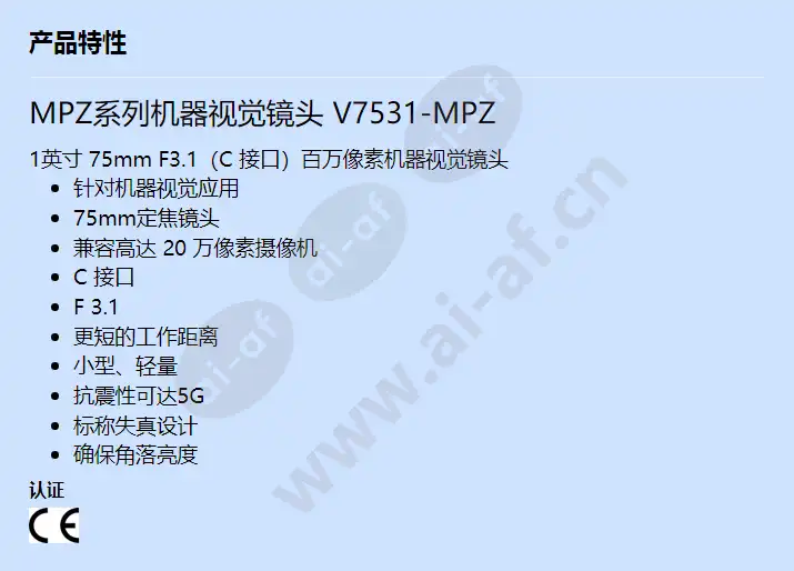 MPZ系列机器视觉镜头 V7531-MPZ 1英寸 75mm F3.1(C 接口)百万像素机器视觉镜头 针对机器视觉应用 75mm定焦镜头 兼容高达 20 万像素摄像机 C 接口 F 3.1 更短的工作距离 小型、轻量 抗震性可达5G 标称失真设计 确保角落亮度 认证