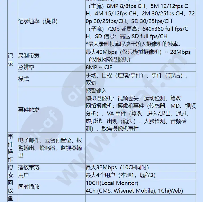 三星韩华 HRX-821-6TB 8 通道 Pentabrid 数字录像机 主要特征: 5合1 8路五位硬盘录像机 包括 6 TB 硬盘 AHD/HDTVI/HDCVI/CVBS/IP 输入 最大模拟8CH + NW 2CH(最大10CH),最高8MP H.265, H.264, MJPEG 8fps@8MP、12fps@5MP、30fps@2MP 录制 同轴控制 智能搜索(仅限网络摄像机) 最多 4 个 SATA HDD(6TB/HDD) HDMI/VGA双显示器 P2P服务(二维码连接) 展示 模拟摄像机 输入 8CH(1Vp-p 75ohm, BNC) 信号类型 AHD(8MP, 5MP, 4MP, 1080p, 720p) HDTVI(8MP, 5MP, 4MP, 1080p, 720p) HDCVI(5MP, 4MP, 1080p, 720p) CVBS(NTSC/PAL) 网络摄像机 输入 最大10路 分辨率 8MP ~ CIF 协议 SUNAPI(Wisenet), ONVIF 实况 本地显示 1x HDMI、1x VGA(双显示器) HDMI:3840 x 2160、1920x1080、1280x720(1920x1080、克隆模式) VGA: 1920x1080, 1280x720 分辨率 (Analog Camera(NTSC/PAL)) - 8MP(15/12fps)、5MP(20/12fps)、4MP(30/25fps)、2MP(30/25fps)、1MP(30/25fps)、960H(或 720H)(30/25fps) * 每个通道 (Network Camera) -典型值。 2MP(480fps) 表现 记录 压缩 H.265, H.264, MJPEG 记录速率(模拟) 模拟摄像机(NTSC/PAL) (主流)8MP 8/8fps