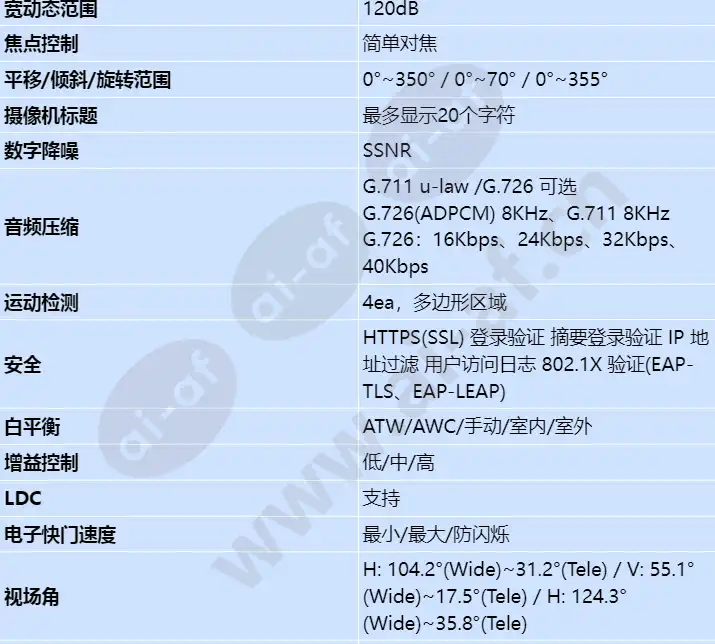 • 最大2百万像素(1920 x 1080)分辨率 • 3.2~10mm (3.1x) 电动变焦镜头 • 0.2Lux@F1.6 (Color), 0Lux (B/W) • 最大30fps@2MP(H.265/H.264) • H.265、H.264、MJPEG 编解码器支持、多流 •白天夜间,WDR (120dB) •篡改、运动检测、散焦检测 • microSD / SDHC / SDXC 内存插槽(最大128GB) •走廊视图,WiseStream 支持 •红外可视长度30m •LDC、PoE/12V 直流 4MP QHD 和 2MP 全高清 Flateye 红外半球摄像机 QNE-7080RV / 7080RVW / 6080RV / 6080RVW 新型高分辨率平眼半球摄像机将解决传统半球摄像机的现有问题。 红外漫反射 例如红外分离、红外光晕或红外眩光 解决潮湿问题 由于摄像机成像器密封在铝制外壳内 减少因外部污染或划伤而遮挡视线的问题 节省人工成本 因为无需拆卸和安装半球盖 4MP 和 2MP 分辨率 Wisenet 提供两种分辨率,让您可以自由选择最适合您安全需求的摄像机。更高质量的分辨率可以对人脸或车牌进行更准确的法医检查。 3.1倍电动变焦镜头 3.2~10mm变焦镜头支持True H:104.2°(广角)~ 31.2°(长焦),视野更加灵活。 散焦检测 散焦检测有助于识别失焦的图像,显着提高效率。用户还可以通过网络远程调整很好焦距(4MP变焦产品),减少摄像机的安装时间。 红外可视长度:30m 现在,在具有挑战性的光照条件或漆黑的黑暗中,您将始终获得长达 30m(98 英尺)的清晰镜头。 用于监控垂直形状区域的走廊视图 在垂直形状的环境中,传统的水平形状的视频集中在区域的不必要的边缘,导致带宽和存储浪费。走廊视图可创建 3:4 和 9:16 比例的图像,该