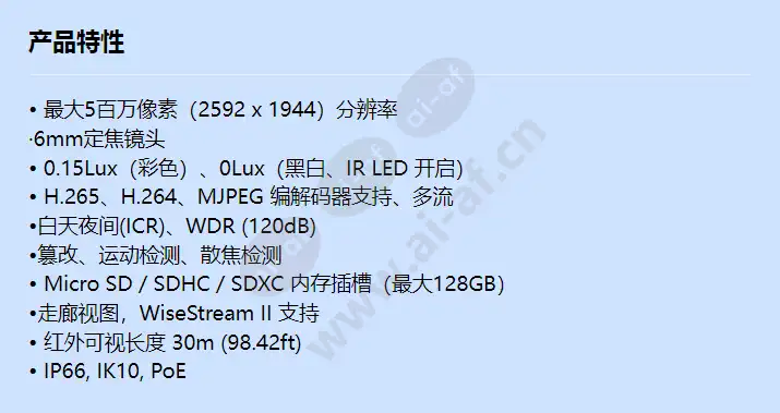 • 最大5百万像素(2592 x 1944)分辨率 ·6mm定焦镜头 • 0.15Lux(彩色)、0Lux(黑白、IR LED 开启) • H.265、H.264、MJPEG 编解码器支持、多流 •白天夜间(ICR)、WDR (120dB) •篡改、运动检测、散焦检测 • Micro SD / SDHC / SDXC 内存插槽(最大128GB) •走廊视图,WiseStream II 支持 • 红外可视长度 30m (98.42ft) • IP66, IK10, PoE 成像装置 1/2.8" CMOS 分辨率 5MP 模式:2592x1944、1920x1080、1280x960、1280x720、800x600、800x448、720x576、720x480、640x480、640x360、320x240 4MP 模式:2560x 1440、1920x1080、1280x960、1280x720、800x600、800x448、720x576、720x480、640x480、640x360、320x240 最大帧率 H.265/H.264:最大30fps/25fps(60Hz/50Hz) MJPEG:最大15fps(@5MP 最大2fps) 最小照明 颜色:0.15Lux(F2.0,1/30秒) 黑白:0Lux(IR LED 开启) 影像输出 CVBS:1.0 Vp-p / 75Ω 复合,720x480(N)、720x576(P) 安装 焦距(变焦比) 6.0mm定焦 最大孔径比 F2.0 视场角 H: 50°/ V: 38°/ D: 61° 焦点控制 固定的 摄像机标题 最多显示85个字符 日夜 Auto(ICR) 背光补偿 BLC, WDR, SSDR 宽动态范围 120dB 数字降噪 SSNR 运动检测 4ea,多边形区域 隐私屏蔽 6ea,矩形区域 增益控制 低