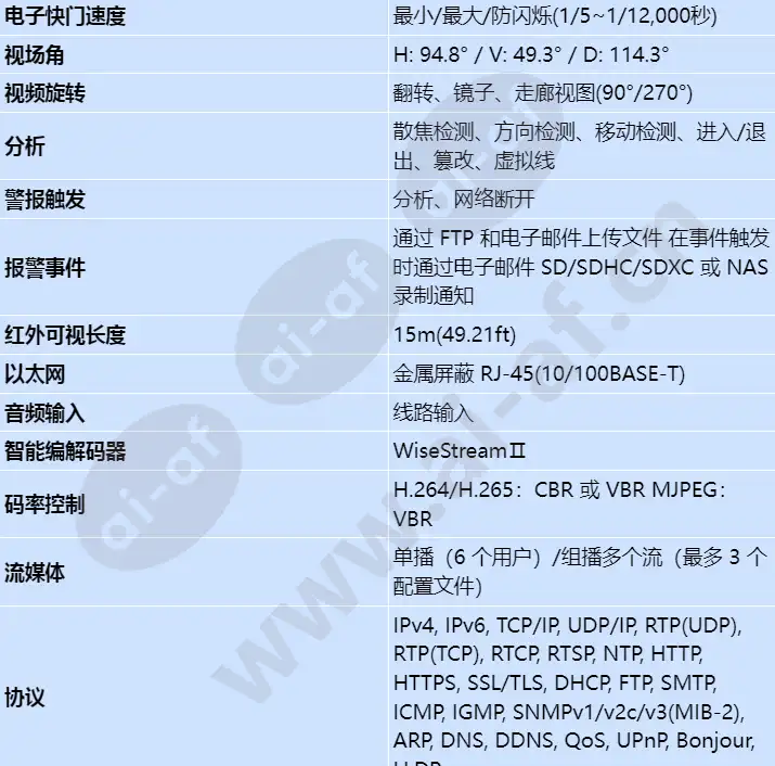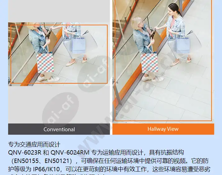 • 最大2百万像素分辨率 • 最大30fps@2MP(H.265/H.264) • 0.03Lux@F2.0(彩色),0Lux(黑白:IR LED 开启) •内置3.6mm固定镜头 • 支持 H.265、H.264、MJPEG 编解码器 •多个流 •白天夜间(ICR)、WDR (120dB) •SD/SDHC/SDXC 内存插槽(最大256GB) •红外可视长度15m,IP66,IK10,NEMA4X • 走廊视图、PoE、LDC 支持 移动网络摄像机 QNV-6023R 和 QNV-6024RM 是移动网络摄像机,具有 2百万像素 1080p 高清图像、3.6 毫米固定镜头、WDR 和 15 米红外 LED 等一系列功能。走廊视图模式针对走廊、隧道和过道进行了优化。 专为交通应用而设计 QNV-6023R 和 QNV-6024RM 专为运输应用而设计,具有抗振结构(EN50155、EN50121),可确保在任何运输环境中提供可靠的视频。它的防护等级为 IP66/IK10,可以在更苛刻的环境中有效工作,这些环境容易遭受恶劣或多变的天气条件以及篡改或物理攻击。 成像装置 1/2.8" CMOS 分辨率 1920x1080, 1280x960, 1280x720, 800x600, 800x448, 720x576, 720x480, 640x480, 640x360 最大帧率 H.265/H.264:最大30fps/25fps(60Hz/50Hz) MJPEG:最大15fps/12fps(60Hz/50Hz) 最小照明 颜色:0.03Lux(F2.0,1/30秒) 黑白:0Lux(IR LED 开启) 影像输出 CVBS:1.0 Vp-p / 75Ω 复合,720x480(N)、720x576(P) 安装 焦距(变焦比) 3.6mm定焦 最大孔径比 F2.0 视场角 H: