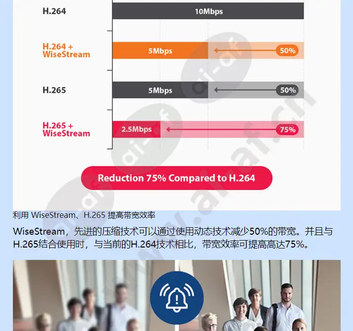 • 最大2M(1920×1080)分辨率 • 2.8 ~ 12mm (4.3x) 变焦镜头 • 最大30fps@2M全分辨率(H.265/H.264) • 支持 H.265、H.264、MJPEG 编解码器,多流 •运动检测、篡改、散焦检测 • microSD (128GB) 内存插槽,PoE / 12V DC 小型摄像机 具有基本素质 价格实惠的产品线提供理想的专业品质 用于保护中小型应用程序 2百万像素和4百万像素分辨率 最大帧率20fps@4M、30fps@2M 走廊视图、镜头畸变校正 真正的宽动态(120dB) 室外摄像机IP66/IK10 H.265, H.264, MJPEG 运动和散焦检测、篡改 WiseStream 边缘存储 紧凑设计 利用 WiseStream、H.265 提高带宽效率 WiseStream,先进的压缩技术可以通过使用动态技术减少50%的带宽。并且与H.265结合使用时,与当前的H.264技术相比,带宽效率可提高高达75%。 散焦检测 散焦检测有助于识别失焦的图像,显着提高效率。用户还可以通过网络远程调整很好焦距(4MP变焦产品),减少摄像机的安装时间。 多种镜头选择 固定镜头 变焦镜头 即使有背光,Wisenet 的顶端 WDR 技术也解决了传统 WDR 摄像机的局限性,同时产生清晰、生动的图像。 WDR 通过解决亮度差异来提高图像的准确性。 采用 Hanwha Techwin 自身先进技术打造的 2.8 ~ 12mm 变焦镜头,支持 True H :109.7°(广角)~ 26.0°(长焦),视野更加灵活。 用于监控垂直形状区域的走廊视图 在垂直形状的环境中,传统的水平形状的视频集中在区域的不必要的边缘,导致带宽和存储浪费。走廊视图创建 3 : 4 和 9 : 16 比例图像,该图像是垂直方向的,可在狭窄的环境中最大限度地提高图像质量
