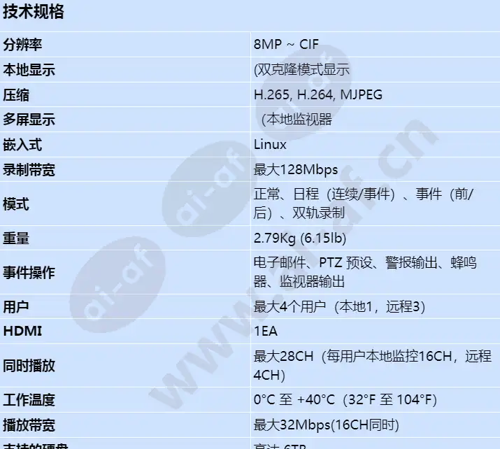• 高达 16CH 8MP 分辨率 • H.265, H.264, MJPEG codec • WiseStream 支持 •128Mbps网络摄像机录制 •双轨录制 • 16 个 PoE 端口即插即用 • 最大2 个 HDD(高达 12TB) • HDMI、VGA 输出 • P2P service(QR code) 双轨录制,减少播放延迟 在窄带网络环境下,在多通道或Wisenet移动应用程序上播放录制的视频时,视频延迟对于用户来说是痛苦的。为了解决这个问题,L系列NVR支持双轨录像,可以同时录制高分辨率码流和VGA码流。此功能减少了通话和播放录制视频的时间。 通过二维码轻松安装,Wisenet 移动应用程序 使用Wisenet移动应用程序,用户无需进行复杂的网络配置即可进行监控。用户只需扫描产品上的二维码即可下载Wisenet移动应用程序。 Wisenet应用程序不仅提供远程监控服务,还提供事件警报和推送通知,以便即时响应。 输入 最大16路 分辨率 8MP ~ CIF 协议 Wisenet, ONVIF 本地显示 (双克隆模式显示 多屏显示 (本地监视器 嵌入式 Linux 压缩 H.265, H.264, MJPEG 录制带宽 最大128Mbps 模式 正常、日程(连续/事件)、事件(前/后)、双轨录制 事件触发 报警输入、视频丢失、摄像机事件(报警、MD、视频分析、散焦) 事件操作 电子邮件、PTZ 预设、警报输出、蜂鸣器、监视器输出 播放带宽 最大32Mbps(16CH同时) 用户 最大4个用户(本地1,远程3) 同时播放 最大28CH(每用户本地监控16CH,远程4CH) 鱼眼矫正 网页/内容管理系统/移动 播放控制 快/慢进/后退,上/下移动一步 支持的硬盘 高达 6TB 硬盘插槽 SATA 2ea(Max. 12TB) 文件备份 BU/Exe(GUI)