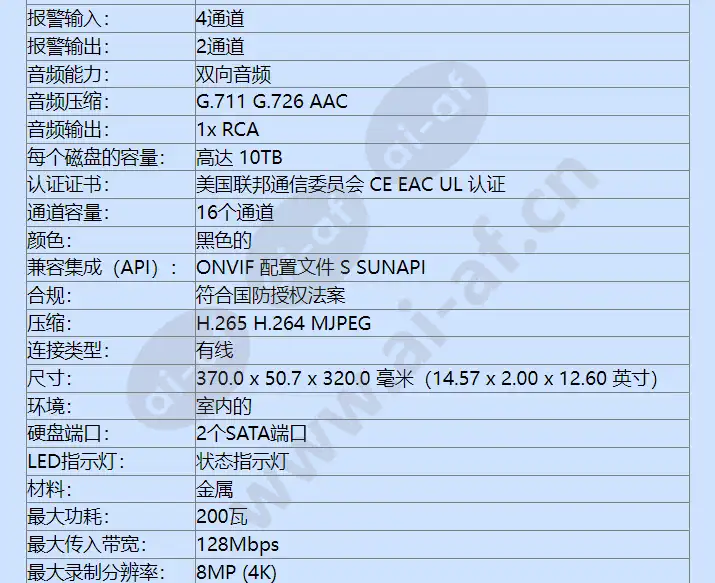 三星韩华 QRN-1630S-20TB 16 通道网络录像机,内置 PoE 端口,20 TB 硬盘 主要特征: 最多16个通道,支持8百万像素 支持H.265、H.264、MJPEG编解码器 128Mbps网络摄像机录制 16个PoE端口即插即用(POE预算130W) 最多支持 2 个硬盘(每个硬盘最大 10Tb) HDMI/VGA本地显示器 P2P服务(二维码连接)支持 双流录制选项,2 个 HDMI 输出,具有本地 4K 显示分辨率(HDMI1:3840x2160(30Hz)、HDMI2:1920x1080(60Hz))- 自动恢复备份 (ARB) 功能(又名边缘录制检索)。四 (4) 个警报输入/两 (2) 个警报输出和音频输出 (RCA)。 使用 P2P 服务(二维码连接)与 Wisenet Mobile APP(适用于 Android 和 IOS)和免费的 Wisenet Viewer 轻松连接。 NDAA FCC Compliant Model. 4K支持: 支持4K 报警输入: 4通道 报警输出: 2通道 音频能力: 双向音频 音频压缩: G.711 G.726 AAC 音频输出: 1x RCA 每个磁盘的容量: 高达 10TB 认证证书: 美国联邦通信委员会 CE EAC UL 认证 通道容量: 16个通道 颜色: 黑色的 兼容集成(API): ONVIF 配置文件 S SUNAPI 合规: 符合国防授权法案 压缩: H.265 H.264 MJPEG 连接类型: 有线 尺寸: 370.0 x 50.7 x 320.0 毫米(14.57 x 2.00 x 12.60 英寸) 环境: 室内的 硬盘端口: 2个SATA端口 LED指示灯: 状态指示灯 材料: 金属 最大功耗: 200瓦 最大传入带宽: 128Mbps 最大录制分辨率: 8MP (4K) 最大存储
