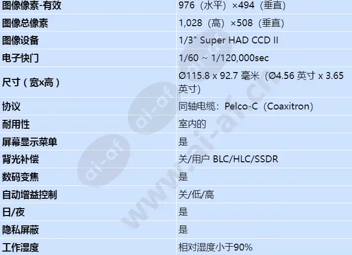 SCD-2081N 是三星高分辨率模拟半球摄像机系列的又一重要补充。该摄像机具有集成到三轴安装座的 2.8 - 11 毫米(3.9 倍)变焦镜头,并利用很好的成像传感器提供 650TVL 的图像质量。此外,True Day Night(ICR 滤镜)、三星超级动态范围(SSDR)和背光控制(BLC)等功能结合在一起,增强了三星传奇的低光性能。该摄像机用途广泛,提供数字图像稳定、运动检测和多种白平衡控制。可以针对不同的条件设置六种不同的用户配置文件,并且摄像机支持通过同轴电缆进行 Coaxitron 控制。由于双电压电源支持以及与 C/CS 安装类型的兼容性,安装非常简单。 650TV线、700TV线(黑白)的高分辨率 很小照度0.1Lux@F1.2(彩色),0.01Lux(黑白) 3.9x V/F 镜头 (2.8 ~ 11mm) 真正的昼夜 (ICR),医学博士,SSNRIII 同轴电缆:Pelco-C(Coaxitron),双电源 特征 隐私屏蔽 运动检测 关/开(8 个可编程区域) 数字降噪 SSNRIII (Off / On) 同步 内部/线路锁定 视频输出 CVBS:1.0 Vp-p / 75Ω 复合 视角 水平:94°(广角)~ 26°(长焦)/垂直:67°(广角)~ 20°(长焦) 背光补偿 关/用户 BLC/HLC/SSDR 镜头尺寸 2.8-11mm 摄像机信号 模拟 镜头类型 Varifocal 耐用性 室内的 自动白平衡 ATW / 室外 / 室内 / 手动 / AWC (1,700K° ~ 11,000K°) 自动增益控制 关/低/高 垂直扫描 59.94Hz 扫描系统 2 : 1 交错 水平扫描 15.734KHz 图像总像素 1,028(高)×508(垂直) 图像设备 1/3" Super HAD CCD II 电子快门 1/60 ~ 1/120