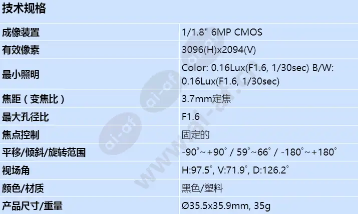 • 0.16Lux@F1.6 Color, B/W • 3.7mm 固定镜头 (5MP) 成像装置 1/1.8" 6MP CMOS 有效像素 3096(H)x2094(V) 最小照明 Color: 0.16Lux(F1.6, 1/30sec) B/W: 0.16Lux(F1.6, 1/30sec) 焦距(变焦比) 3.7mm定焦 最大孔径比 F1.6 视场角 H:97.5˚, V:71.9˚, D:126.2˚ 焦点控制 固定的 平移/倾斜/旋转范围 -90˚~+90˚ / 59˚~66˚ / -180˚~+180˚ 颜色/材质 黑色/塑料 产品尺寸/重量 Ø35.5x35.9mm, 35g