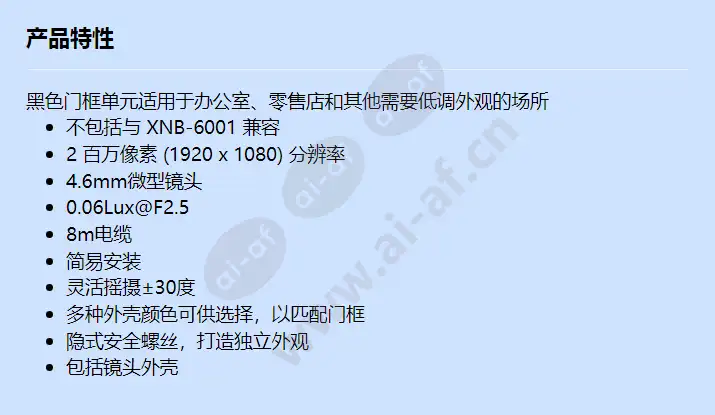 黑色门框单元适用于办公室、零售店和其他需要低调外观的场所 不包括与 XNB-6001 兼容 2 百万像素 (1920 x 1080) 分辨率 4.6mm微型镜头 0.06Lux@F2.5 8m电缆 简易安装 灵活摇摄±30度 多种外壳颜色可供选择,以匹配门框 隐式安全螺丝,打造独立外观 包括镜头外壳