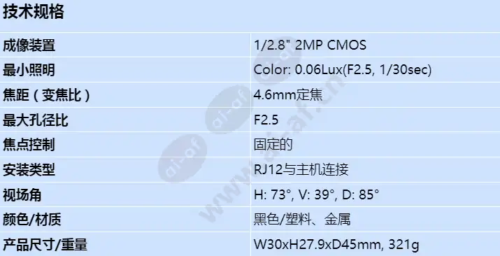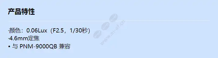 ·颜色:0.06Lux(F2.5,1/30秒) ·4.6mm定焦 • 与 PNM-9000QB 兼容 成像装置 1/2.8" 2MP CMOS 最小照明 Color: 0.06Lux(F2.5, 1/30sec) 焦距(变焦比) 4.6mm定焦 最大孔径比 F2.5 视场角 H: 73°, V: 39°, D: 85° 安装类型 RJ12与主机连接 焦点控制 固定的 颜色/材质 黑色/塑料、金属 产品尺寸/重量 W30xH27.9xD45mm, 321g