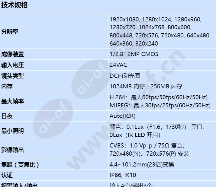 • 最大2M(1920×1080)分辨率 • 16 : 9 全高清 (1080p) 分辨率支持 • H.264、MJPEG 双编解码器、多流 •白天夜间(ICR)、WDR (120dB) •自动跟随、智能视频分析 • 23 倍(4.4 ~ 101.2 毫米)光学变焦、16 倍数码变焦 成像装置 1/2.8" 2MP CMOS 分辨率 1920x1080, 1280x1024, 1280x960, 1280x720, 1024x768, 800x600, 800x448, 720x576, 720x480, 640x480, 640x360, 320x240 最大帧率 H.264:最大60fps/50fps(60Hz/50Hz) MJPEG:最大30fps/25fps(60Hz/50Hz) 最小照明 颜色:0.1Lux(F1.6,1/30秒) 黑白:0Lux(IR LED 开启) 影像输出 CVBS:1.0 Vp-p / 75Ω 复合,720x480(N)、720x576(P) 安装 焦距(变焦比) 4.4~101.2mm(23倍)变焦 最大孔径比 F1.6(Wide)~F4.5(Tele) 视场角 H: 63.68°(Wide)~3.1°(Tele) / V: 37.52°(Wide)~1.76°(Tele) 最小物距 1.5m(4.92ft) 焦点控制 单次自动对焦 镜头类型 DC自动光圈 平移范围 360°无尽 平移速度 Preset: 250°/sec, Manual: 0.024°/sec~120°/sec 倾斜范围 190°(-5°~185°) 俯仰速度 Preset: 250°/sec, Manual: 0.024°/sec~120°/sec 顺序 预设(255个)、摇摆、组(6个)、跟踪、巡视、自动运行、时间表 预设精度 ±0.2° 摄像机标题 最多显示15个