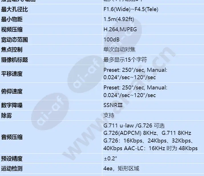 • 最大2M(1920×1080)分辨率 • 16 : 9 全高清 (1080p) 分辨率支持 • 23 倍(4.4 ~ 101.2 毫米)光学变焦、12 倍数码变焦 • H.264、MJPEG 双编解码器、多流 •白天夜间(ICR)、WDR (100dB) •智能视频分析 成像装置 1/2.8" 2MP CMOS 分辨率 1920x1080, 1280x1024, 1280x960, 1280x720, 1024x768, 800x600, 800x448, 720x576, 720x480, 640x480, 640x360, 320x240 最大帧率 H.264:最大30fps/25fps(60Hz/50Hz) MJPEG:最大30fps/25fps(60Hz/50Hz) 最小照明 颜色:0.1Lux(F1.6,1/30秒) 黑白:0Lux(IR LED 开启) 影像输出 CVBS:1.0 Vp-p / 75Ω 复合,720x480(N)、720x576(P) 安装 焦距(变焦比) 4.4~101.2mm(23倍)变焦 最大孔径比 F1.6(Wide)~F4.5(Tele) 视场角 H: 63.68°(Wide)~3.1°(Tele) / V: 37.52°(Wide)~1.76°(Tele) 最小物距 1.5m(4.92ft) 焦点控制 单次自动对焦 镜头类型 DC自动光圈 平移范围 360°无尽 平移速度 Preset: 250°/sec, Manual: 0.024°/sec~120°/sec 倾斜范围 190°(-5°~185°) 俯仰速度 Preset: 250°/sec, Manual: 0.024°/sec~120°/sec 顺序 预设(255个)、摇摆、组(6个)、跟踪、巡视、自动运行、时间表 预设精度 ±0.2° 摄像机标题 最多显示15个字符 日夜