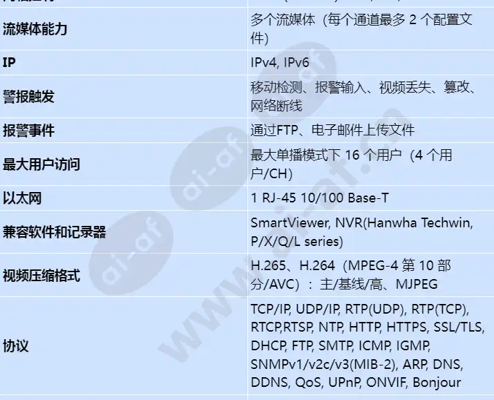 •最大分辨率:5MP ·最大帧速率:12fps@5MP • H.265、H.264、MJPEG 编解码器支持 • 多个流(每个通道最多 2 个配置文件) • 1 个 RJ-45 10/100 Base-T 输入通道 4CH BNC,1.0 Vp-p / 75Ω 复合 NTSC/PAL 输入信号及分辨率 CVBS、AHD/CVI/TVI (1、2、4、5MP) 自动检测 影像输出 1 个 HDMI 输出(4 个多图像,1920x1080) 运动检测 关/开 隐私屏蔽 关/开(4ea 矩形区域) 去隔行 支持 报警输入/输出 4输入/2输出 警报触发 移动检测、报警输入、视频丢失、篡改、网络断线 报警事件 通过FTP、电子邮件上传文件 音频输入/输出 4线输入/1线输出(1 NO/COM/NC, 1 NO/COM) OSD 标题 远程控制接口 1ea RS-485(Half Duplex) RS-485协议 SAMSUNG-T, PELCO-P/D 同轴控制 CVBS(Pelco-C) AHD, TVI, CVI 以太网 1 RJ-45 10/100 Base-T 视频压缩格式 H.265、H.264(MPEG-4 第 10 部分/AVC):主/基线/高、MJPEG 分辨率 2560x1920, 2560x1440, 1920x1080, 1280x720, 928x480(N), 928x240(N), 704x480(N), 704x240(N), 640x368, 352x240(N) 928x576(P), 928*288(P), 704x576(P), 704x288(P), 640x368, 352x288(P) 最大帧率 - 主码流 5MP : 12fps/CH, 4MP : 15fps/CH, 1080p/720p/WD1/4CIF/CIF :
