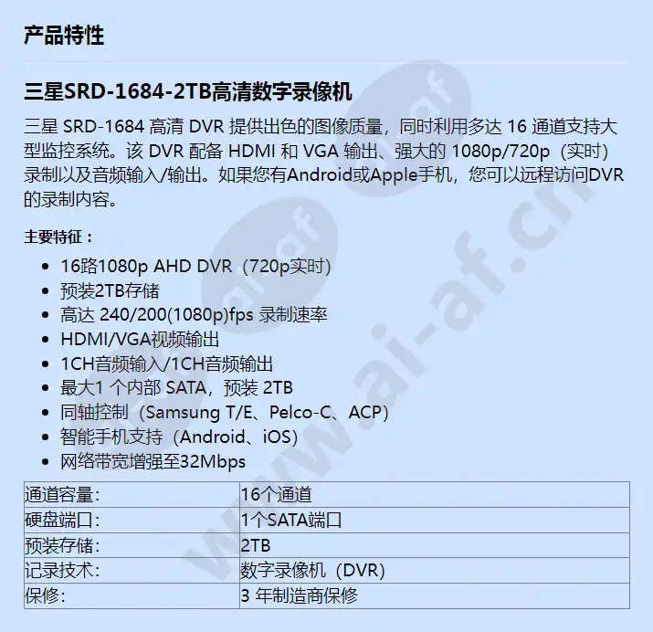 三星SRD-1684-2TB高清数字录像机 三星 SRD-1684 高清 DVR 提供出色的图像质量,同时利用多达 16 通道支持大型监控系统。该 DVR 配备 HDMI 和 VGA 输出、强大的 1080p/720p(实时)录制以及音频输入/输出。如果您有Android或Apple手机,您可以远程访问DVR的录制内容。 主要特征: 16路1080p AHD DVR(720p实时) 预装2TB存储 高达 240/200(1080p)fps 录制速率 HDMI/VGA视频输出 1CH音频输入/1CH音频输出 最大1 个内部 SATA,预装 2TB 同轴控制(Samsung T/E、Pelco-C、ACP) 智能手机支持(Android、iOS) 网络带宽增强至32Mbps 通道容量: 16个通道 硬盘端口: 1个SATA端口 预装存储: 2TB 记录技术: 数字录像机(DVR) 保修: 3 年制造商保修