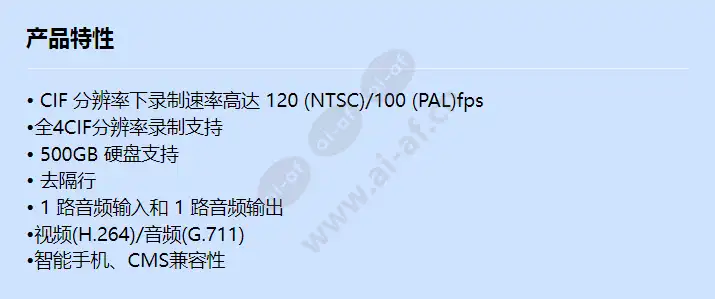 • CIF 分辨率下录制速率高达 120 (NTSC)/100 (PAL)fps •全4CIF分辨率录制支持 • 500GB 硬盘支持 • 去隔行 • 1 路音频输入和 1 路音频输出 •视频(H.264)/音频(G.711) •智能手机、CMS兼容性 搜索并播放 是的 存储 BU(DVR 播放器)、EXE(包括播放器) 智能手机 1CH 冗余 G.711 ULAW (8KHz, 16Bit) 简单配置 4/1 同轴控制 2