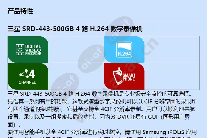 三星韩华 Samsung Hanwha SRD-443-500GB 4通道 H.264 数字录像机