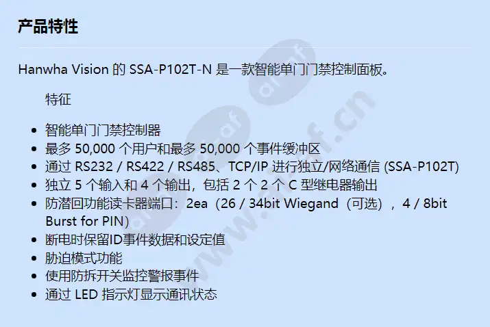 Hanwha Vision 的 SSA-P102T-N 是一款智能单门门禁控制面板。 特征 智能单门门禁控制器 最多 50,000 个用户和最多 50,000 个事件缓冲区 通过 RS232 / RS422 / RS485、TCP/IP 进行独立/网络通信 (SSA-P102T) 独立 5 个输入和 4 个输出,包括 2 个 2 个 C 型继电器输出 防潜回功能读卡器端口:2ea(26 / 34bit Wiegand(可选),4 / 8bit Burst for PIN) 断电时保留ID事件数据和设定值 胁迫模式功能 使用防拆开关监控警报事件 通过 LED 指示灯显示通讯状态