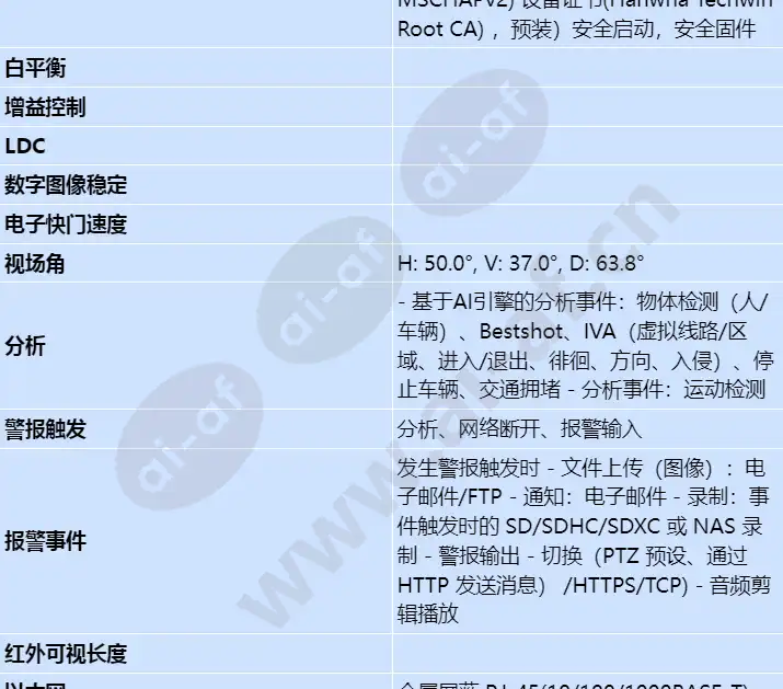 •双光谱:VGA 热敏 8MP 可见光传感器 • 一台设备、一个 IP 的双(热可见光)通道 • 最大30fps @ 所有分辨率 (H.265/H.264) • 镜头:9.1mm 固定热感 4.4~9.3mm 电动变焦可见 •白天夜间(ICR)、WDR(120dB) •最大红外可视长度:30m •降噪:WiseNR II(基于AI引擎,仅可见) •智能编解码器:WiseStream III(基于AI引擎,可见)、WiseStream II(热) •基于AI的视频分析 • IP66/IP67、IK10、NEMA4X、NEMA TS 2(2.2.8、2.2.9) • PoE+(IEEE802.3at), 12VDC •壁杆安装一体化设计 4K AI 摄像机物体检测和热感摄像机温度检测 基于人工智能的双光谱摄像机以 4K 分辨率单独检测每个人。双光谱摄像机热视频检测温度变化,防止可能发生的事故。 具体来说,它通过检查肉眼无法清晰区分的热点区域的热图像,告知观看者可触摸的危险区域。 通过热图像实现远距离、不清晰环境中的物体检测 在远距离或黑暗环境中区分物体存在挑战。为了克服这些挑战, 双光谱热成像摄像机让用户清晰监控物体。 成像装置 非制冷微测辐射热计 分辨率 640x480(可缩放至 1280x960)1280x960、1280x720、1024x768、800x600、800x448、720x576、720x480、640x480、640x360 最大帧率 H.265/H.264:最大30fps/25fps(AI 2CH 开启 - 15fps) 3帧/秒 NETD <60mK 像素大小 12㎛ 最小照明 影像输出 USB:Micro USB B 型,1280x720 用于安装 焦距(变焦比) 9.1mm定焦 最大孔径比 F1.0 视场角 H: 50.0°, V: 37.0°