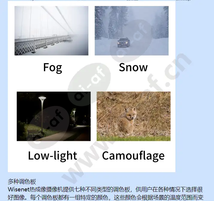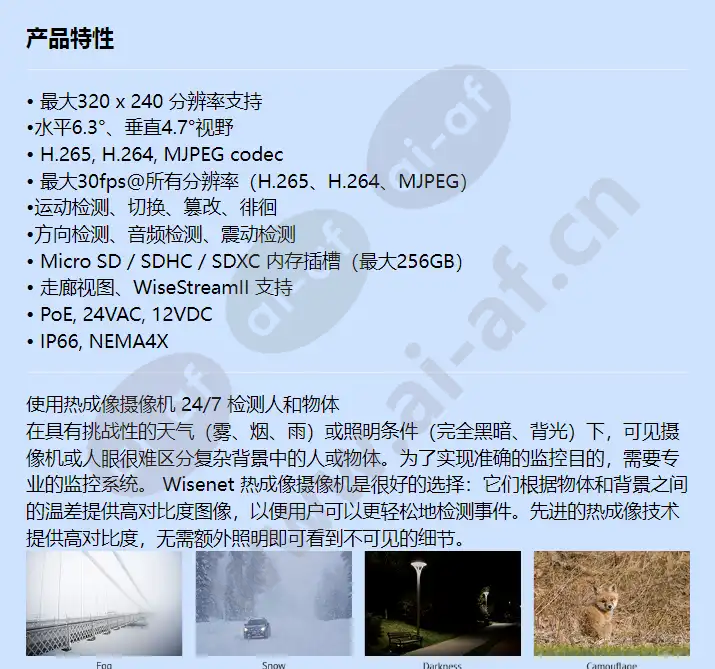 • 最大320 x 240 分辨率支持 •水平6.3°、垂直4.7°视野 • H.265, H.264, MJPEG codec • 最大30fps@所有分辨率(H.265、H.264、MJPEG) •运动检测、切换、篡改、徘徊 •方向检测、音频检测、震动检测 • Micro SD / SDHC / SDXC 内存插槽(最大256GB) • 走廊视图、WiseStreamII 支持 • PoE, 24VAC, 12VDC • IP66, NEMA4X 使用热成像摄像机 24/7 检测人和物体 在具有挑战性的天气(雾、烟、雨)或照明条件(完全黑暗、背光)下,可见摄像机或人眼很难区分复杂背景中的人或物体。为了实现准确的监控目的,需要专业的监控系统。 Wisenet 热成像摄像机是很好的选择:它们根据物体和背景之间的温差提供高对比度图像,以便用户可以更轻松地检测事件。先进的热成像技术提供高对比度,无需额外照明即可看到不可见的细节。 多种调色板 Wisenet热成像摄像机提供七种不同类型的调色板,供用户在各种情况下选择很好图像。每个调色板都有一组特定的颜色,这些颜色会根据场景的温度范围而变化。 保护各种应用程序的安全 Wisenet 热成像摄像机可以成为监控光线很少的应用时的强大工具,因为它们能够根据热量创建图像。热成像摄像机特别适用于制造和工业设施、机场和海港以及采矿区域。 成像装置 非制冷微测辐射热计 分辨率 320x240 最大帧率 H.265/H.264:最大30fps/25fps(60Hz/50Hz) MJPEG:最大30fps/25fps(60Hz/50Hz) NETD <60mK 像素大小 12㎛ 影像输出 CVBS:1.0 Vp-p / 75Ω 复合,720x480(N)、720x576(P) 安装 USB:Micro USB Type B,1280x720 安装