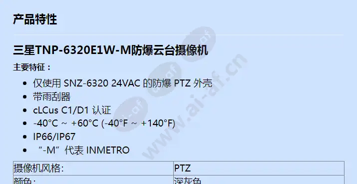 三星TNP-6320E1W-M防爆云台摄像机 主要特征: 仅使用 SNZ-6320 24VAC 的防爆 PTZ 外壳 带雨刮器 cLCus C1/D1 认证 -40°C ~ +60°C (-40°F ~ +140°F) IP66/IP67 “-M”代表 INMETRO 摄像机风格: PTZ 颜色: 深灰色 压缩: MJPEG H.264 Durability: 防风雨 环境: 户外的 主要特征: Day/Night 镜头尺寸: 4.44~142.6mm 镜头类型: 电动(自动变焦)镜头 光学变焦: 32倍光学变焦 保护码: IP67 Resolution: 2MP Technology: 网络(IP) 保修: 3 年制造商保修 宽动态范围 (WDR): 真宽动态120dB