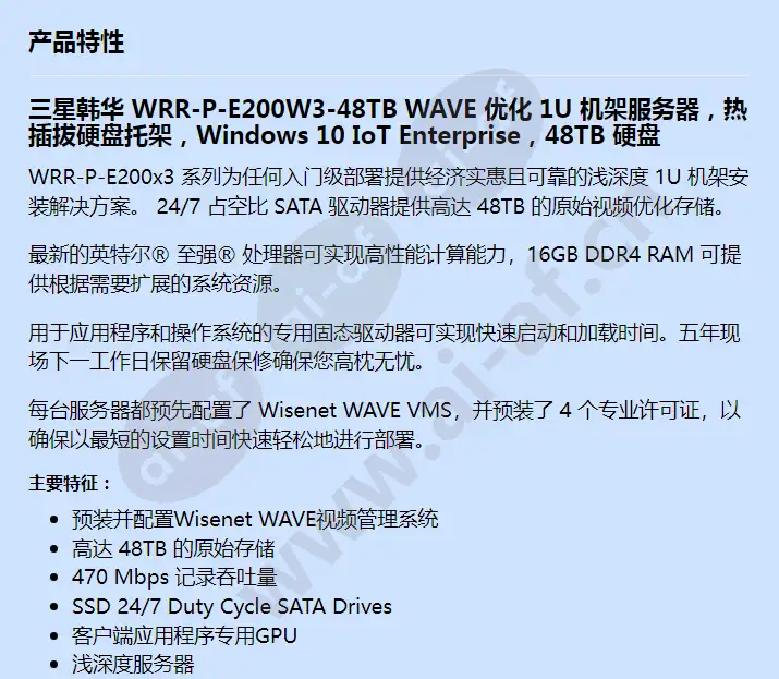 三星韩华 WRR-P-E200W3-48TB WAVE 优化 1U 机架服务器,热插拔硬盘托架,Windows 10 IoT Enterprise,48TB 硬盘 WRR-P-E200x3 系列为任何入门级部署提供经济实惠且可靠的浅深度 1U 机架安装解决方案。 24/7 占空比 SATA 驱动器提供高达 48TB 的原始视频优化存储。 最新的英特尔® 至强® 处理器可实现高性能计算能力,16GB DDR4 RAM 可提供根据需要扩展的系统资源。 用于应用程序和操作系统的专用固态驱动器可实现快速启动和加载时间。五年现场下一工作日保留硬盘保修确保您高枕无忧。 每台服务器都预先配置了 Wisenet WAVE VMS,并预装了 4 个专业许可证,以确保以最短的设置时间快速轻松地进行部署。 主要特征: 预装并配置Wisenet WAVE视频管理系统 高达 48TB 的原始存储 470 Mbps 记录吞吐量 SSD 24/7 Duty Cycle SATA Drives 客户端应用程序专用GPU 浅深度服务器 包括USB鼠标和键盘 包括带理线臂的滑动机架导轨 5 年现场下一工作日保修,保留您的硬盘保修 支持符合 Wisenet 和 ONVIF 标准的 IP 摄像机 IPMI管理 由 Windows 10 IoT 企业版提供支持 4K支持: 支持4K 音频能力: 双向音频 每个磁盘的容量: 高达 12TB 认证证书: 美国联邦通信委员会 cUL UL 认证 CB 80+铜牌 颜色: 黑色的 兼容集成(API): ONVIF 智网开放平台 合规: 符合国防授权法案 尺寸: 482.6 x 614.68 x 42.8 毫米(19 x 24.2 x 1.67 英寸) 磁盘形状因数: 3.5" 环境: 室内的 硬盘端口: 4个SATA端口 包含的许可证: 4 Wisenet WAVE 专业许