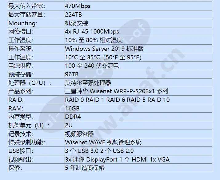 三星韩华 WRR-P-S202S1-96TB WAVE 优化 2U 机架服务器,配备 Windows Server 2019 标准操作系统,96TB 存储 WRR-P-S202S1 为任何入门级部署提供经济实惠且可靠的 2U 机架安装解决方案。 24/7 占空比 SATA 驱动器提供高达 224TB 的原始视频优化存储。 最新的英特尔® 至强® 处理器可实现高性能计算能力,16GB DDR4 RAM 可提供根据需要扩展的系统资源。 用于应用程序和操作系统的专用固态驱动器可实现快速启动和加载时间。支持 RAID 0、1、5、6 和 10 存储配置,可提高可靠性,并且 5 年现场下一工作日保留硬盘保修可确保您高枕无忧。 每台服务器都预先配置了 Wisenet WAVE VMS,并预装了 4 个专业许可证,以确保以最短的设置时间快速轻松地进行部署。 主要特征: 预装并配置Wisenet WAVE视频管理系统 470 Mbps 记录吞吐量 针对 RAID 6 预先配置 高达 224TB 的原始存储 支持RAID 0、1、5、6、10配置 SSD 24/7 Duty Cycle SATA Drives 客户端应用程序专用GPU IPMI管理 包括USB鼠标和键盘 包括带理线臂的滑动机架导轨 5 年现场下一工作日保修,保留您的硬盘保修 支持符合 Wisenet 和 ONVIF 标准的 IP 摄像机 配置Windows Server 2019标准版 4K支持: 支持4K 认证证书: 80+白金 cUL CB 美国联邦通信委员会 UL 认证 颜色: 黑色的 兼容集成(API): 智网开放平台 ONVIF 合规: 符合国防授权法案 连接类型: 有线 尺寸: 482.6 x 646 x 86.8 毫米(19 x 28.15 x 3.4 英寸) 环境: 室内的 硬盘端口: 14个SATA端口