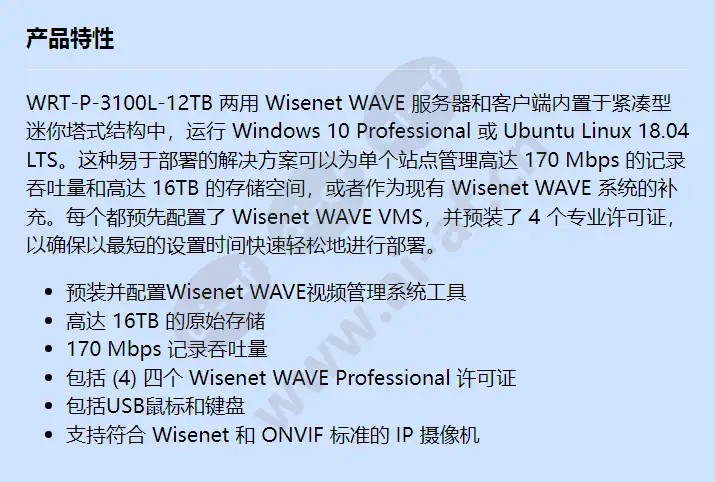 三星韩华 Samsung Hanwha WRT-P-3100L-12TB Wisenet WAVE 网络录像机