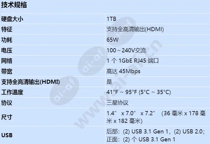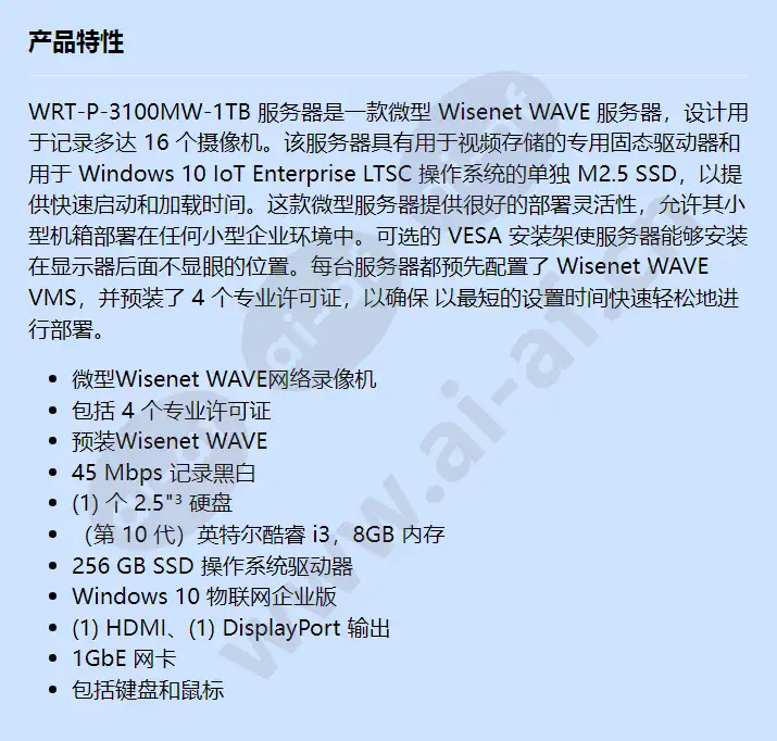 WRT-P-3100MW-1TB 服务器是一款微型 Wisenet WAVE 服务器,设计用于记录多达 16 个摄像机。该服务器具有用于视频存储的专用固态驱动器和用于 Windows 10 IoT Enterprise LTSC 操作系统的单独 M2.5 SSD,以提供快速启动和加载时间。这款微型服务器提供很好的部署灵活性,允许其小型机箱部署在任何小型企业环境中。可选的 VESA 安装架使服务器能够安装在显示器后面不显眼的位置。每台服务器都预先配置了 Wisenet WAVE VMS,并预装了 4 个专业许可证,以确保 以最短的设置时间快速轻松地进行部署。 微型Wisenet WAVE网络录像机 包括 4 个专业许可证 预装Wisenet WAVE 45 Mbps 记录黑白 (1) 个 2.5"³ 硬盘 (第 10 代)英特尔酷睿 i3,8GB 内存 256 GB SSD 操作系统驱动器 Windows 10 物联网企业版 (1) HDMI、(1) DisplayPort 输出 1GbE 网卡 包括键盘和鼠标 工作温度 41°F ~ 95°F (5°C ~ 35°C) 硬盘大小 1TB 协议 三星协议 特征 支持全高清输出(HDMI) 带宽 高达 45Mbps 尺寸 1.4” x 7.0” x 7.2”(36 毫米 x 178 毫米 x 182 毫米) 电压 100~240V交流 功耗 65W 网络 1 个 1GbE RJ45 端口 USB 后部:(2) USB 3.1 Gen 1,(2) USB 2.0;正面:(2) 个 USB 3.1 Gen 1 支持全高清输出(HDMI) 是