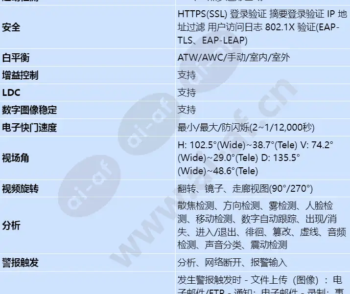 •最大5MP分辨率 • 0.07Lux@F1.4 (Color), 0.007Lux@F1.4 (B/W) •白天夜间(ICR)、WDR(150dB/120dB) •模块化结构和电动PTRZ • 走廊视图,WiseStreamII 支持 •视频音频分析、音频播放 •内置陀螺仪传感器的 DIS 和震动检测 • IP52/阻燃等级 (UL2820)、PoE、12VDC 2MP / 5MP NW 模块化摄像机 安装速度更快,成本降低 先进性能,倍增价值 2MP / 5MP NW 模块化摄像机 最大2百万像素5百万像素分辨率 视频音频分析、音频播放 内置陀螺仪传感器的 DIS 和震动检测 模块化结构和机动PTRZ 安装者友好的包装设计 IP67/IP66/IP6K9K, IK10+, NEMA4X(XNV-6081Z/8081Z) 很强芯片组WISENET 5 Wisenet X 系列由有史以来集成到全摄像机系列中的很强大的芯片组增强。 Wisenet 5芯片采用全新架构,可实现更快的处理速度。这意味着您可以根据需要获得很好的视频性能。 模块化结构,电动PTRZ,安装方便 Wisenet X PLUS 摄像机采用模块化结构和电动 PTRZ,易于安装。产品包已更新,以节省安装和维护的时间和金钱。 扩展倾斜范围,提高灵活性 增加了扩展的倾斜角度,以提高 Wisenet X PLUS 摄像机的放置和使用案例的灵活性。 内置陀螺仪传感器的高级 DIS 和震动检测 Wisenet X PLUS 摄像机具有内置陀螺仪传感器,可实现先进的 DIS,减少运动模糊和检测摄像机何时受到撞击的震动检测。 在具有挑战性的环境中具有高可靠性 安全摄像机最重要的功能之一是在充满挑战的环境中的可靠性。 Wisenet X PLUS 摄像机具有 IP67、IP66、IP6K9K 和 IK10+ 等级的耐候性和抗冲