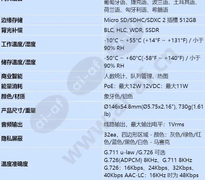 • 最大2048×2048分辨率 • 支持 H.265、H.264、MJPEG 编解码器 •鱼眼、单全景、双全景、四视图 • 板载扭曲校正、数字 PTZ (8x)、双向音频 •真正的WDR (120dB),支持WiseStreamⅡ • 篡改、徘徊、定向检测 •音频检测、声音分类、热图 •人数统计、队列管理 成像装置 1/1.8" 6M CMOS 分辨率 原始视图:2048x2048、1280x1280、1080x1080、960x960、768x768、720x720、640x640、480x480 单张全景:2048x512、1920x480、1280x320、640x 160、704x176 双全景:2048x1024、1920x960、1280x640、640x320、704x352 四视图:2048x1536、1600x1200、 1280x960、1024x768、800x600、640x480、704x576 Q1/2/3/4:1024x768、800x600、640x480 最大帧率 H.264/H.265:30fps/25fps@2048x2048(60Hz/50Hz) MJPEG:最大15fps 最小照明 颜色:0.1 勒克斯(F1.6,1/30 秒),黑白:0 勒克斯(IR LED 开启) 影像输出 CVBS:1.0 Vp-p / 75Ω 复合,714x480(N)、702x576(P),用于安装 USB:Micro USB Type B,用于安装 焦距(变焦比) 1.6mm定焦 最大孔径比 F1.6 视场角 H: 192˚ / V: 192˚ / D: 192˚ 最小物距 0.3m 焦点控制 通过网络简单遥控对焦 摄像机标题 最多显示85个字符 日夜 Auto(ICR) 背光补偿 BLC, HLC, WDR, SSDR 宽动态范围 120dB 数字降