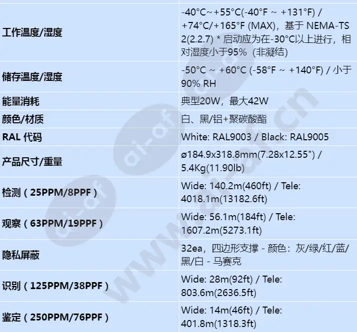 • 最大4K分辨率 • 5~150mm(30 倍) 光学变焦(数码 32 倍,总计 960 倍变焦) • 最大红外可视长度200m •日夜(ICR)、极端WDR、DIS(内置陀螺仪传感器) •智能分析、物体自动跟随(人/车)、目标锁定跟随 • H.264, H.265, MJPEG codec, WiseStreamII • IP66, IK10, NEMA4X, NEMA-TS 2(2.2.8, 2.2.9) • 采用 PTZ PLUS 设计(紧凑、更轻、布线简单) • 由注入器支持的 SFP 4K分辨率和30倍变焦,云台性能强大 PTZ PLUS 通过内部开发的新型 4K 30 倍变焦镜头支持很好的性能。体验强大的全新云台性能。 基于AI的物体自动跟随 PTZ PLUS支持基于AI深度学习算法的物体(人或车辆)自动跟随。 只需右键单击屏幕上的对象,即可锁定该对象并跟随目标对象。 (目标锁定跟随) Wise IR,在每个变焦倍率下提供优化的 IR PTZ PLUS 允许使用 Wise IR 在完全黑暗的情况下进行长达 200 米的监控。它优化了每个变焦比下的红外量。 成像装置 1/2.8" CMOS 分辨率 3840x2160, 2592x1944, 2592x1464, 1920x1080, 1600x1200, 1280x1024, 1280x960, 1280x720, 1024x768, 800x600, 800x448, 720x576, 720x480, 640x480, 640x360, 320x240 最大帧率 H.265/H.264:最大30fps/25fps(60Hz/50Hz) MJPEG:最大30fps/25fps(60Hz/50Hz) 最小照明 颜色:0.1Lux(F1.6,1/30秒) 黑白:0Lux(IR LED 开启) 焦距(变焦比)
