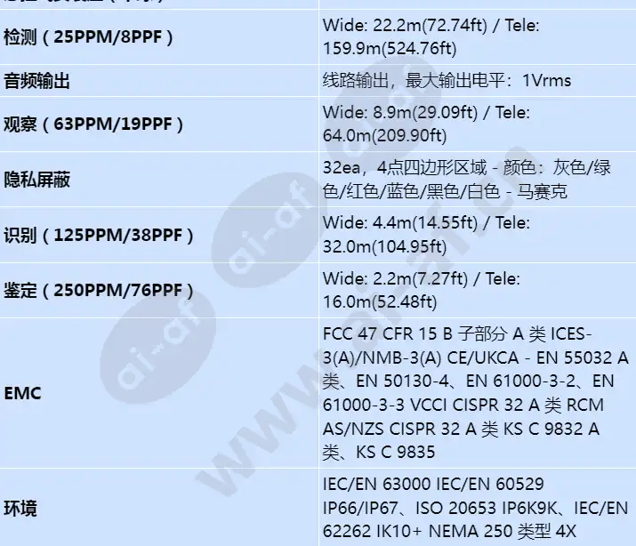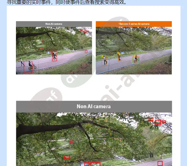 • 2MP 分辨率 • 2.8~12mm (4.3x) 电动变焦 •颜色:0.01Lux(F1.4、1/30秒、30IRE)、0 Lux(IR LED 开启) •最大120 fps (H.265/H.264) • WiseIR:红外可视长度 50 m (164.04 ft) • 白天夜间 (ICR)、极端 WDR (150 dB) •硬涂层半球罩 •WiseNRⅡ(基于AI引擎)、WiseStreamⅢ(基于AI引擎) •基于人工智能引擎(NPU)的分析事件:对象检测(人/脸/车辆 - 汽车、卡车、公共汽车、自行车、摩托车/车牌), IVA(虚拟线路/区域、进入/退出、徘徊、方向、入侵) •分析事件:散焦检测、运动检测、篡改、雾检测 音频检测、声音分类、震动检测、出现/消失 • IP66/IP67/IP6K9K, NEMA4X, IK10+ 基于AI减少误报 新款X系列摄像机利用人工智能对人、车辆、人脸、车牌等进行实时检测和分类。摄像机的深度学习算法具有从 2MP 到 4K 的一系列可用分辨率,可以可靠地识别多个不同的物体。减少由于没有有趣的运动(例如被风吹动的树木、阴影或动物)而导致的误报。分析成为操作员可靠的第二双眼睛,帮助他们了解在哪里寻找重要的实时事件,同时使事件后查看搜索变得高效。 基于人工智能的物体检测提高运营效率 包括信息(人、脸、车辆、车牌)在内的元数据发送到后端服务器,用于提取特定事件的信息。运营商可以在后端服务器上搜索AI事件。这极大地提高了搜索效率并减少了搜索事件所花费的时间。也可减少操作人员监控现场时的误报。 基于AI的WiseNRII和快门控制 WiseNRII 是一项新的增强功能,它利用人工智能来识别物体运动并减少嘈杂、低光环境中的模糊。基于人工智能的快门技术根据运动中的分类物体和场景中的照明条件自动调整快门速度,以减少运动模糊并提供最清晰的图像