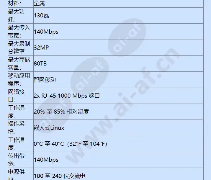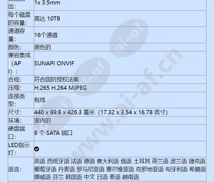 三星韩华 XRN-1620B2-30TB 16 通道 4K 网络录像机,30TB 存储 主要特征: 最多16路,支持最高32百万像素摄像机分辨率 140Mbps网络摄像机录制 支持 HDMI 显示器上的 4K 视频输出 支持双显示器HDMI/VGA视频输出 H.265、H.264、MJPEG 压缩 WiseStream 支持 最多 8 个内置 HDD (80TB) ARB故障转移(N+1)、动态事件、Wisenet AI元数据搜索支持 4K支持: 支持4K 报警输入: 4通道 报警输出: 2通道 音频能力: 双向音频 音频输出: 1x 3.5mm 每个磁盘的容量: 高达 10TB 通道容量: 16个通道 颜色: 黑色的 兼容集成(API): SUNAPI ONVIF 合规: 符合国防授权法案 压缩: H.265 H.264 MJPEG 连接类型: 有线 尺寸: 440 x 89.8 x 426.3 毫米(17.32 x 3.54 x 16.78 英寸) 环境: 室内的 硬盘端口: 8 个 SATA 端口 LED指示灯: 语言: 英语 西班牙语 法语 德语 意大利语 俄语 土耳其 荷兰语 波兰语 捷克语 葡萄牙语 丹麦语 罗马尼亚语 塞尔维亚语 克罗地亚语 匈牙利语 希腊语 挪威语 芬兰 韩国语 中文 日语 泰语 越南语 材料: 金属 最大功耗: 130瓦 最大传入带宽: 140Mbps 最大录制分辨率: 32MP 最大存储容量: 80TB 移动应用程序: 智网移动 网络接口: 2x RJ-45 1000 Mbps 端口 工作湿度: 20% 至 85% 相对湿度 操作系统: 嵌入式Linux 工作温度: 0°C 至 40°C(32°F 至 104°F) 传出带宽: 140Mbps 电源供应: 100 至 240 伏交流电 预装存储: 30TB 产品系列: 三星韩华