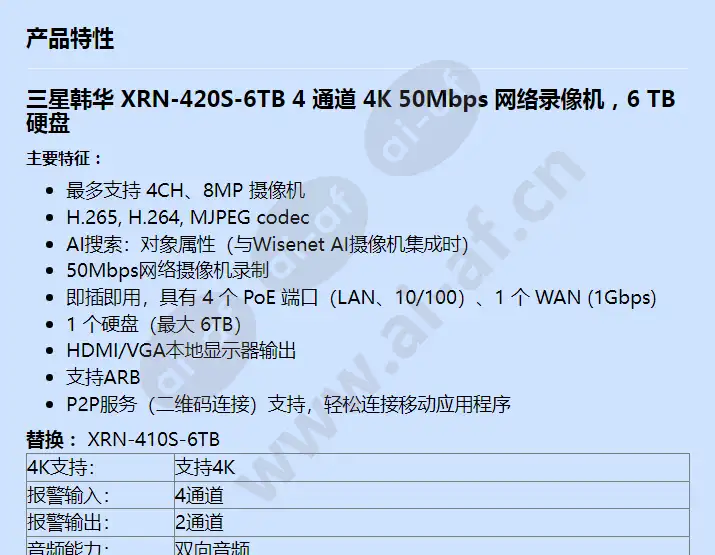 三星韩华 XRN-420S-6TB 4 通道 4K 50Mbps 网络录像机,6 TB 硬盘 主要特征: 最多支持 4CH、8MP 摄像机 H.265, H.264, MJPEG codec AI搜索:对象属性(与Wisenet AI摄像机集成时) 50Mbps网络摄像机录制 即插即用,具有 4 个 PoE 端口(LAN、10/100)、1 个 WAN (1Gbps) 1 个硬盘(最大 6TB) HDMI/VGA本地显示器输出 支持ARB P2P服务(二维码连接)支持,轻松连接移动应用程序 替换: XRN-410S-6TB 4K支持: 支持4K 报警输入: 4通道 报警输出: 2通道 音频能力: 双向音频 音频压缩: G.711 G.726 AAC 音频输出: 1x RCA 每个磁盘的容量: 高达 6TB 认证证书: UL 认证 通道容量: 4通道 颜色: 黑色的 兼容集成(API): ONVIF 配置文件 S SUNAPI 合规: 符合国防授权法案 压缩: H.265 H.264 MJPEG 连接类型: 有线 尺寸: 300 x 47 x 208.7 毫米(11.81 x 1.85 x 8.21 英寸) 环境: 室内的 硬盘端口: 1个SATA端口 材料: 金属 最大功耗: 67 瓦 最大传入带宽: 50Mbps 最大录制分辨率: 8MP (4K) 最大存储容量: 6TB 移动应用程序: 智网移动 网络接口: 1x RJ-45 10/100/1000 Mbps 4x RJ-45 10M/100M Base-TX 以太网 PoE 端口数量: 4 个 PoE 端口 工作湿度: 20% 至 85% 相对湿度 操作系统: 嵌入式Linux 工作温度: 0°C 至 40°C(32°F 至 104°F) 功率预算: 50瓦 电源供应: 100 至 240 伏交流电 预装存储: