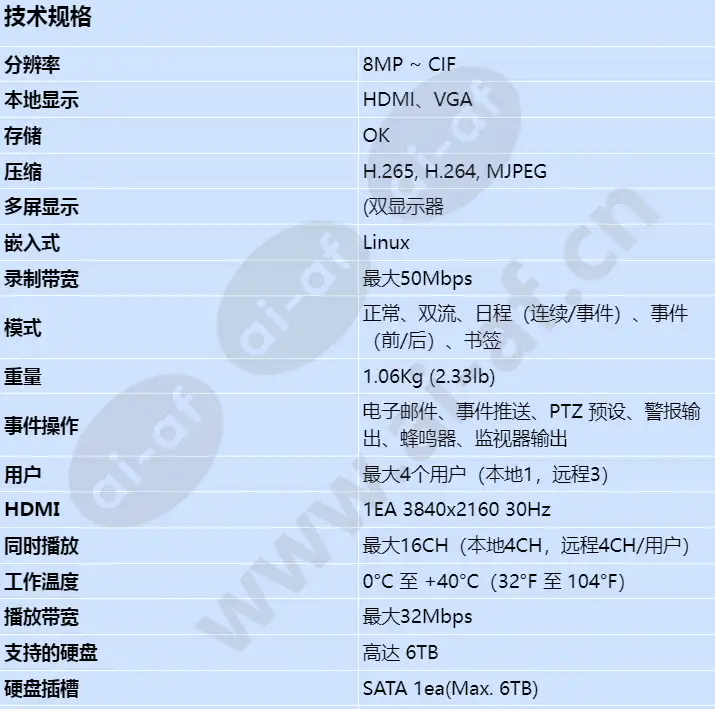 • 最多支持 4CH、8MP 摄像机 • H.265, H.264, MJPEG codec •AI搜索:对象属性(与Wisenet AI摄像机集成时) •50Mbps网络摄像机录制 • 4 个 PoE(LAN、10/100)、1 个 PoE(WAN、1Gbps)即插即用 • 最大1HDD(最大6TB) • HDMI / VGA 本地监视器 •支持ARB •P2P服务(QR码连接)支持 输入 最大4路 分辨率 8MP ~ CIF 协议 SUNAPI, ONVIF 本地显示 HDMI、VGA 多屏显示 (双显示器 嵌入式 Linux 压缩 H.265, H.264, MJPEG 录制带宽 最大50Mbps 模式 正常、双流、日程(连续/事件)、事件(前/后)、书签 事件触发 报警输入、视频丢失、摄像机事件(传感器、MD、视频分析、散焦、音频)、动态事件 事件操作 电子邮件、事件推送、PTZ 预设、警报输出、蜂鸣器、监视器输出 播放带宽 最大32Mbps 用户 最大4个用户(本地1,远程3) 同时播放 最大16CH(本地4CH,远程4CH/用户) 鱼眼矫正 CMS 播放控制 快/慢进/后退,上/下移动一步 支持的硬盘 高达 6TB 硬盘插槽 SATA 1ea(Max. 6TB) 文件备份 BU/Exe(GUI), JPG/AVI(Network) 功能 多通道(最多4CH)播放,日期时间/标题显示 协议 IPv4, IPv6, TCP/IP, UDP/IP, RTP (UDP), RTP (TCP), RTSP, NTP, HTTP, DHCP (Server, Client), SMTP, ICMP, IGMP, ARP, DNS, DDNS, uPnP, HTTPS, SNMP, ONVIF (Profile-S), SUNAPI(Server, Client) DDNS