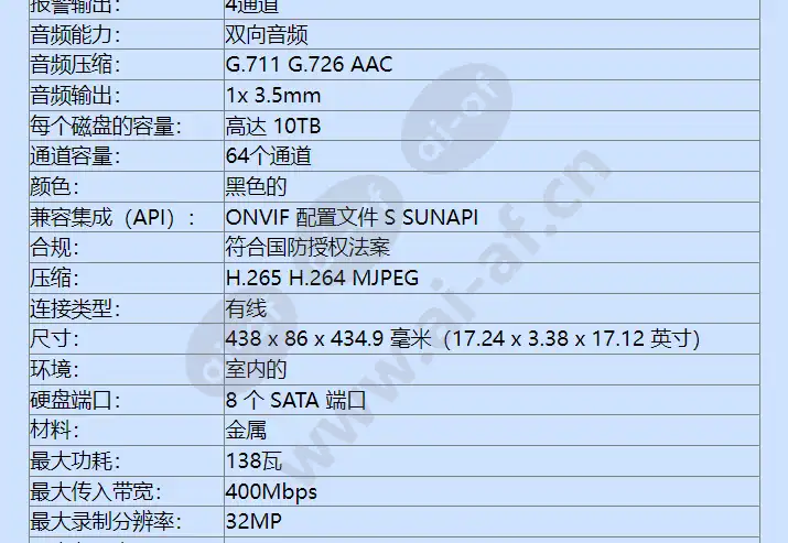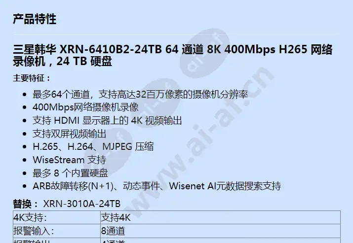三星韩华 XRN-6410B2-24TB 64 通道 8K 400Mbps H265 网络录像机,24 TB 硬盘 主要特征: 最多64个通道,支持高达32百万像素的摄像机分辨率 400Mbps网络摄像机录像 支持 HDMI 显示器上的 4K 视频输出 支持双屏视频输出 H.265、H.264、MJPEG 压缩 WiseStream 支持 最多 8 个内置硬盘 ARB故障转移(N+1)、动态事件、Wisenet AI元数据搜索支持 替换: XRN-3010A-24TB 4K支持: 支持4K 报警输入: 8通道 报警输出: 4通道 音频能力: 双向音频 音频压缩: G.711 G.726 AAC 音频输出: 1x 3.5mm 每个磁盘的容量: 高达 10TB 通道容量: 64个通道 颜色: 黑色的 兼容集成(API): ONVIF 配置文件 S SUNAPI 合规: 符合国防授权法案 压缩: H.265 H.264 MJPEG 连接类型: 有线 尺寸: 438 x 86 x 434.9 毫米(17.24 x 3.38 x 17.12 英寸) 环境: 室内的 硬盘端口: 8 个 SATA 端口 材料: 金属 最大功耗: 138瓦 最大传入带宽: 400Mbps 最大录制分辨率: 32MP 最大存储容量: 80TB 移动应用程序: 智网移动 Mounting: 独立 网络接口: 3x RJ-45 1000 Mbps 端口 工作湿度: 20% 至 85% 相对湿度 操作系统: 嵌入式Linux 工作温度: 0°C 至 40°C(32°F 至 104°F) 传出带宽: 400 Mbps 电源供应: 100 至 240 伏交流电 预装存储: 24TB 产品系列: 三星韩华 Wisenet X 系列 记录技术: 网络录像机(NVR) 远程用户: 最多32个 特殊录制功能: 人工智能搜索支