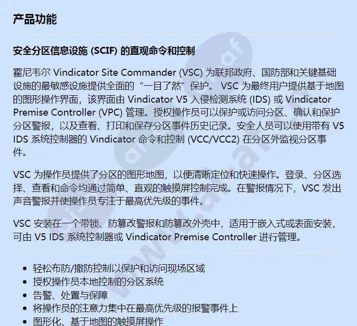 安全分区信息设施 (SCIF) 的直观命令和控制 霍尼韦尔 Vindicator Site Commander (VSC) 为联邦政府、国防部和关键基础设施的最敏感设施提供全面的“一目了然”保护。 VSC 为最终用户提供基于地图的图形操作界面,该界面由 Vindicator V5 入侵检测系统 (IDS) 或 Vindicator Premise Controller (VPC) 管理。授权操作员可以保护或访问分区、确认和保护分区警报,以及查看、打印和保存分区事件历史记录。安全人员可以使用带有 V5 IDS 系统控制器的 Vindicator 命令和控制 (VCC/VCC2) 在分区外监视分区事件。 VSC 为操作员提供了分区的图形地图,以便清晰定位和快速操作。登录、分区选择、查看和命令均通过简单、直观的触摸屏控制完成。在警报情况下,VSC 发出声音警报并使操作员专注于最高优先级的事件。 VSC 安装在一个带锁、防篡改警报和防篡改外壳中,适用于嵌入式或表面安装,可由 V5 IDS 系统控制器或 Vindicator Premise Controller 进行管理。 轻松布防/撤防控制以保护和访问现场区域 授权操作员本地控制的分区系统 告警、处置与保障 将操作员的注意力集中在最高优先级的报警事件上 图形化、基于地图的触摸屏操作 单一操作界面的多分区控制 DIACAP / USAF ATO 认证就绪 单分区多操作界面控制 根据站点策略配置的声音警报 查看事件历史记录,包括警报、操作员活动和 ACS 条目 打印并保存历史记录 符合 ICD-705 符合 FIPS-140-2 NIST 认证的 AES 加密 美国空军批准和认证 零件号 描述 AE VSC - 维护者站点指挥官 548-52000-01 AE 守备官站点指挥官 (Win 7) 548-52000-11 AE 守备官站
